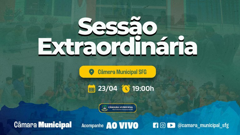 A Sessão Extraordinária acontecerá no dia 23/04/2026 a partir das 19h00min, no Plenário Vereador Gerson Paulino na Câmara Municipal de São Francisco do Guaporé, e terá transmissão ao vivo pelo Facebook, Instagram, Youtube e aqui no site da Câmara.